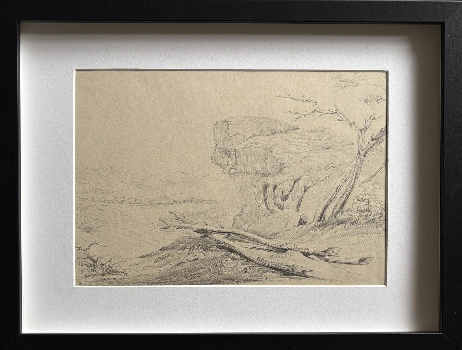 A Framed finely detailed antique pencil drawing depicting a dramatic rocky cliffside with a leaning tree, fallen branches in the foreground, and a sweeping view of distant mountains. Executed with delicate linework and precise shading, the composition captures both the rugged textures of the rock face and the quiet expansiveness of the landscape beyond. The artist has skillfully balanced natural detail with atmospheric depth, evoking the Romantic tradition of 19th-century landscape sketching.